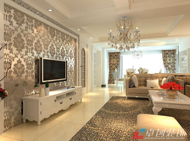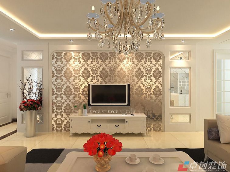 電視背景墻效果圖 :明亮的地磚,精致的壁紙,亮麗的銀鏡,整個風(fēng)格豪華、富麗,充滿強(qiáng)烈的動感效果。