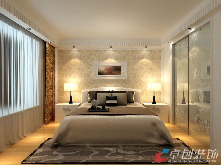 主臥室效果圖:以暖色壁紙,搭配玻璃罩吸頂燈柔和的燈光,營造溫雅舒適的休息環(huán)境。