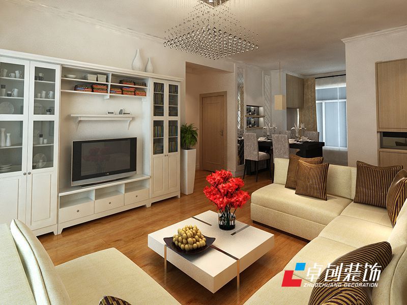 客廳效果圖:在客廳的柜體上采用了電視柜搭配書(shū)柜的方式做出一個(gè)回型,讓收納功能增強(qiáng)。
