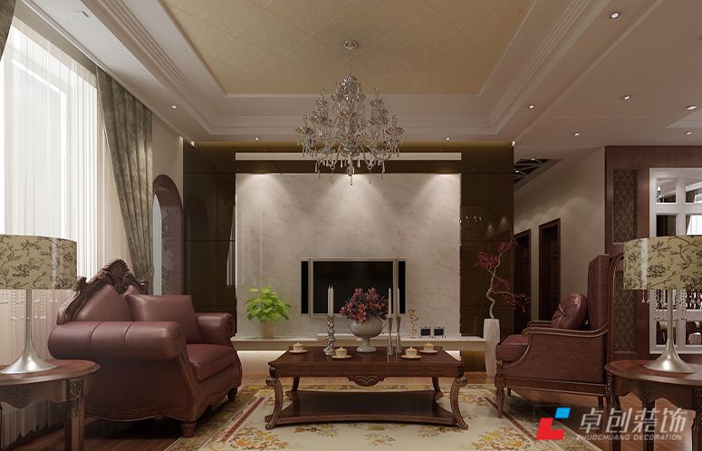 客廳效果圖:影視墻的造型簡(jiǎn)潔現(xiàn)代,在吊頂上配以華麗的水晶吊燈,這種絕妙的組合給人以強(qiáng)烈的視覺意志力,成為時(shí)尚與古典的柔媚結(jié)合。