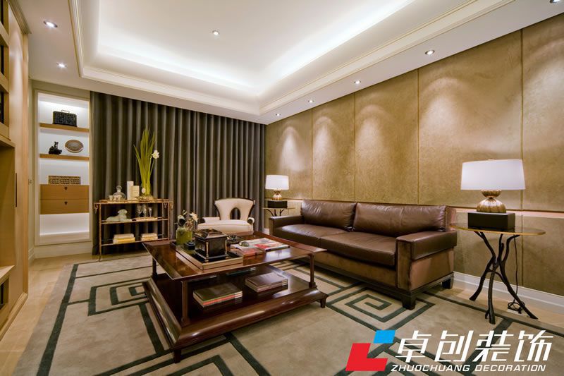 接待室效果圖:皮質(zhì)沙發(fā)與沙發(fā)背景墻同一色系,使整體風格看起來高端大氣,地毯的選擇也要與沙發(fā)背景墻顏色統(tǒng)一?臻g整體要色系統(tǒng)一。