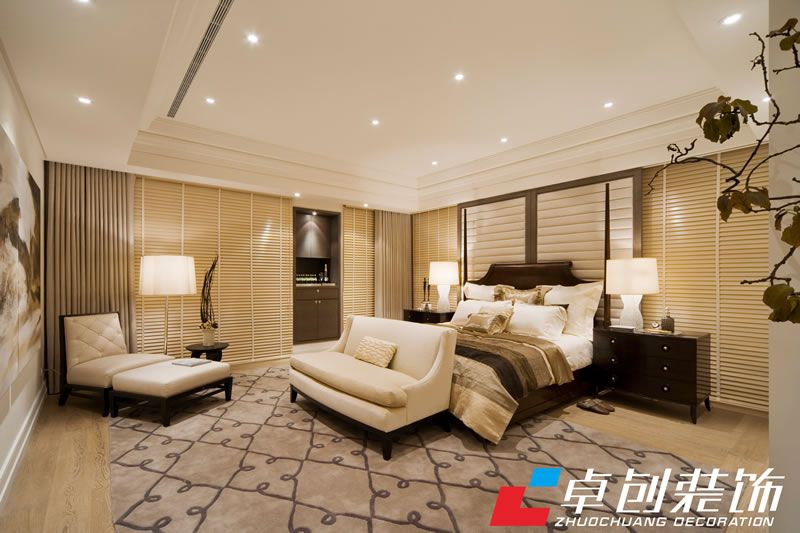 主臥室效果圖:米色軟包與百葉窗主要選用暖色系,臥室的整體色調(diào)要溫馨。地毯的選擇上與臥室的整體風格統(tǒng)一。