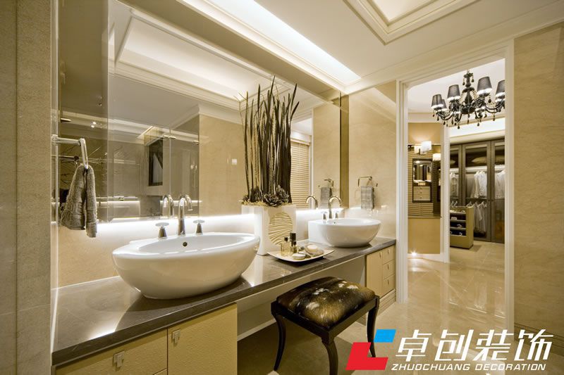 衛(wèi)生間效果圖:衛(wèi)生間的整面鏡子起到了拓展空間的效果,主要以米色系的瓷磚為主。