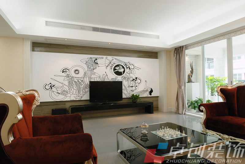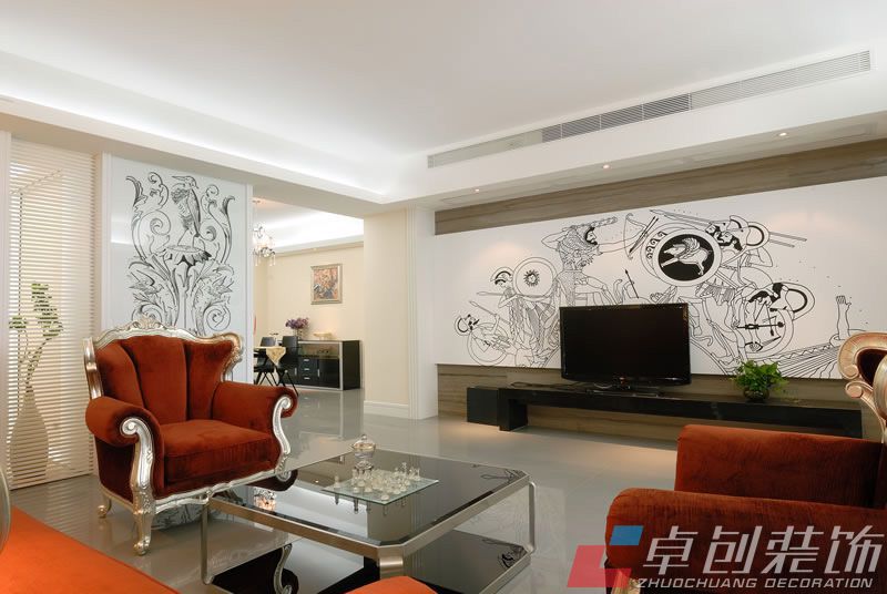 電視背景墻效果圖:背景墻采用簡(jiǎn)單的黑白裝飾風(fēng)格,以黑白為主色調(diào)加以紅色的軟裝進(jìn)行調(diào)節(jié),使整個(gè)空間更加簡(jiǎn)單而大氣。