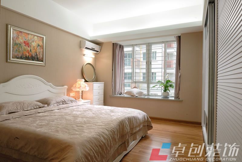 臥室效果圖:白色吊頂、衣柜與原生態(tài)的地板相組合,樸實(shí)自然。