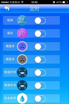 現(xiàn)代化“鬧鐘”,早晨,當(dāng)您還在熟睡,臥室的窗簾準(zhǔn)時(shí)自動(dòng)拉開,溫暖的陽光輕灑入室,輕柔的音樂慢慢響起,呼喚您開始全新生活每一天;當(dāng)您起床洗漱時(shí),微波爐(電飯煲)已開始為您烹飪?cè)绮停涂梢择R上享受營養(yǎng)早餐啦;餐畢不久,音響自動(dòng)關(guān)機(jī),提醒您趕快上班,整個(gè)過程你幾乎不用去看手表;輕按門廳口的 “離家模式”鍵,所有的燈和電器全部熄滅,安防系統(tǒng)自動(dòng)布防,這樣您就可以安心上班去啦!當(dāng)您和家人外出旅游時(shí),可設(shè)置主人在家的虛擬場(chǎng)景,這樣小偷就不敢隨意輕舉妄動(dòng)啦!輕松定制生活場(chǎng)景,定時(shí)開關(guān)燈和電器!