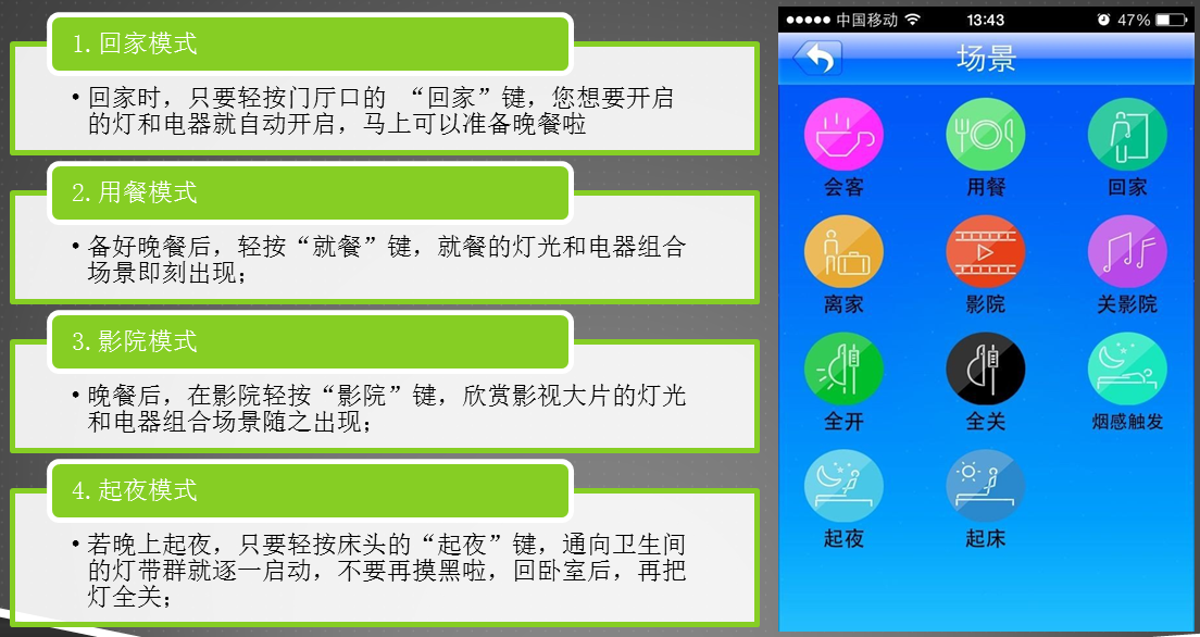 回家時(shí),只要輕按門廳口的 “回家”鍵,您想要開啟的燈和電器就自動(dòng)開啟,馬上可以準(zhǔn)備晚餐啦;備好晚餐后,輕按“就餐”鍵,就餐的燈光和電器組合場(chǎng)景即刻出現(xiàn);晚餐后,在影院輕按“影院”鍵,欣賞影視大片的燈光和電器組合場(chǎng)景隨之出現(xiàn);若晚上起夜,只要輕按床頭的“起夜”鍵,通向衛(wèi)生間的燈帶群就逐一啟動(dòng),不要再摸黑啦,回臥室后,再把燈全關(guān);您是不是覺得生活比以前更神奇而富有意思呢?夢(mèng)幻場(chǎng)景,身臨其境!只有想不到,沒有做不到!