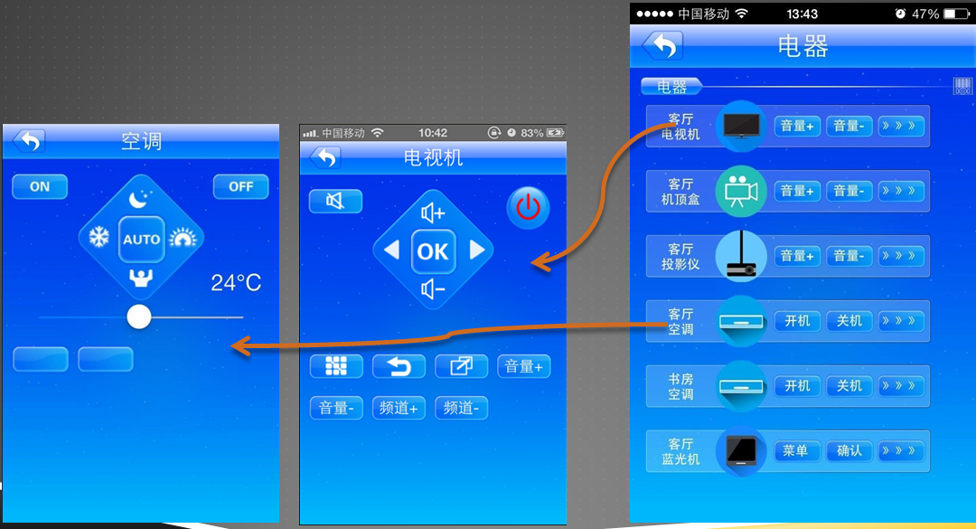 使用你手中的iPad 平板電腦來作為智能家居的控制觸摸屏,嘗試去控制你家里的所有的燈光、窗簾等等,你會(huì)體驗(yàn)到科技帶來的生活智能與方便。更方便的是不用增加任何成體,使用你手上的iPhone 手機(jī)或Android手機(jī)也可以變成家居控制的觸摸屏,無論在家還是在全世界,你也能隨手控制你的家居。讓你體驗(yàn)現(xiàn)代通訊產(chǎn)品與頂級(jí)智能家居完全結(jié)合。使用頂級(jí)智能家居,你即將體驗(yàn)到智控未來的感覺!
